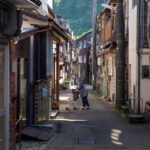 Le village, coincé entre montagne et mer, s’est construit dans un espace très restreint. Les maisons de deux ou trois étages se serrent le long d’une ruelle étroite où aucune voiture ne peut passer. Pas de restaurant, juste un mini supermarché. C’est le matin, l’ambiance est vraiment douce. « Shitsurei shimasu ! » s’excusent les livreurs en faisant coulisser les portes des petites maisons. Les obachan s’affairent avec leurs fleurs, d’autres bavardent entre elles. Leurs maris ne sont plus rentrés depuis longtemps. Quant aux jeunes, s’il en reste, ils sont probablement partis pêcher.